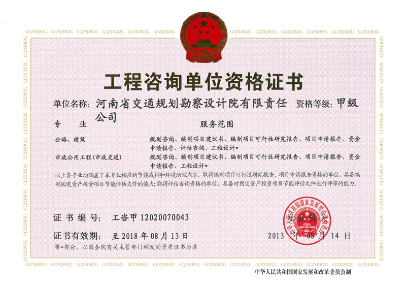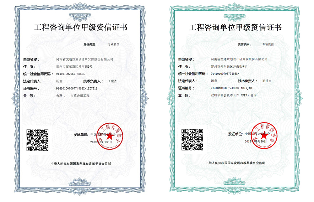 交通规划院立足河南,面向全国,拓展海外,不断发展壮大,目前已拥有公路、市政公用工程、政府和社会资本合作(ppp)咨询等多个甲级资信证书,同时先后入库国家财政部、省财政厅以及河南省内多个地市ppp专业咨询机构库,储备了一大批优秀的专业人才。多年来,先后完成中原经济区综合交通运输体系规划、促进中部崛起公路水路发展规划、河南省国省道线位规划,郑州都市圈、洛阳、焦作、永城等市县综合交通运输发展规划、援柬埔寨国家路网规划、河南省高速公路网规划,以及近万公里高速公路、3000多公里干线公路、市政道路可研项目和50多项ppp投融资咨询项目。
