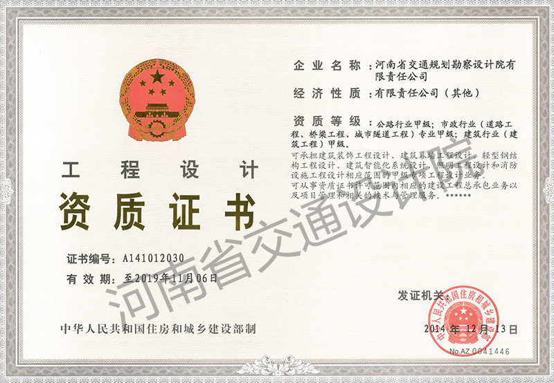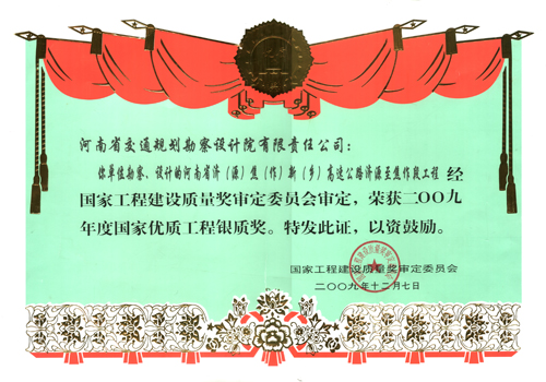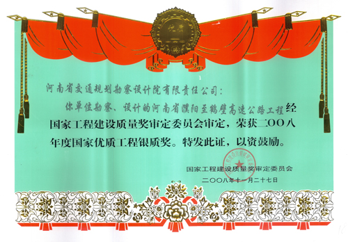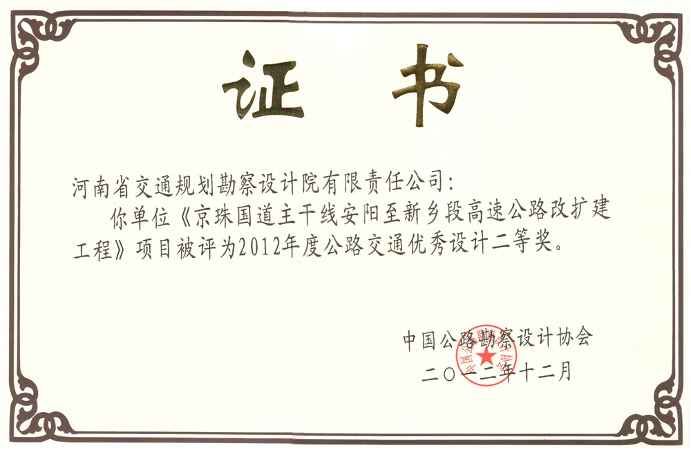 公司先后荣获国家级奖励30余项、省部级奖励170余项,其中濮鹤高速公路获得国家优质工程银质奖,济(源)焦(作)新(乡)高速公路济源至焦作段工程设计获全国优秀工程勘察设计奖铜奖及国家优质工程银质奖,京港澳安阳至新乡段高速公路改扩建获国家公路设计二等奖。