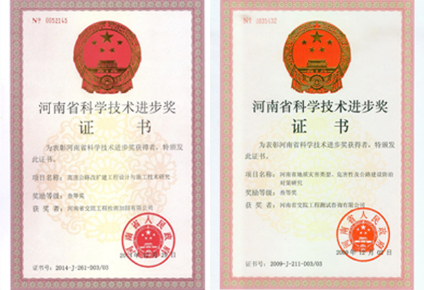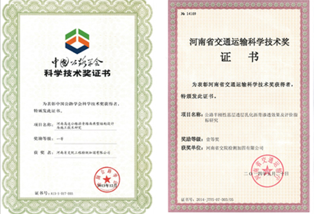 公司自成立以来,共开展各类科研项目40余项,其中获得中国公路学会科技进步一等奖2项、三等奖2项,交通部科技进步一等奖1项,交通系统科技进步三等奖1项,河南省科技进步二等奖2项、三等奖10项,河南省交通科技进步一等奖7项、二等奖6项、三等奖2项,申请获得专利近10项,是河南省公路工程检测领域的先进技术团队。