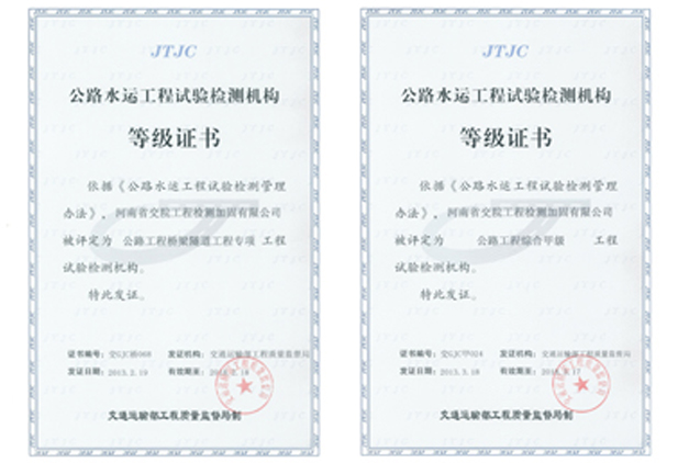 河南省交院工程检测科技有限公司是河南省交通规划设计研究院股份有限公司的全资子公司,2006年7月注册为法人公司。公司拥有公路工程综合甲级试验检测资质、公路工程桥梁隧道工程专项试验检测资质,并持有中国合格评定国家认可委员会颁发的实验室认可证书、河南省质量技术监督局颁发的计量认证证书,可开展公路工程各类常规及特殊试验检测项目986项。 公司现有职工400余人,其中博士4人,硕士80人,教授级高级工程师9人、高级工程师40人,工程师101人,一级注册结构工程师1人,注册岩土工程师3人,试验检测师146人,助理试验检测师118人。