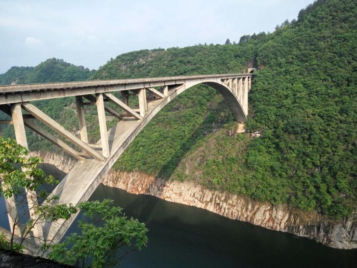 江界河大桥位于贵州省瓮安县江界河风景区,在瓮安县城以北48公里处跨越乌江的震天洞峡谷中,大桥全长461米,桥型为主跨330m的大跨度预应力混凝土桁式组合拱桥。设计荷载为汽车-超20级,挂车-120,人群荷载3kn/m2。...