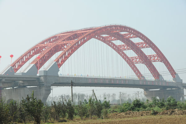 河南省岭南高速蒲山特大桥位于岭南高速与兰南高速公路的联络线上,与南水北调中线总干渠一期工程、焦枝铁路交叉。全长1703米,桥面宽度38.8米,拱桥跨度达225米,拱肋最高处距地面72米。桥面为双向六车道,设计车...
