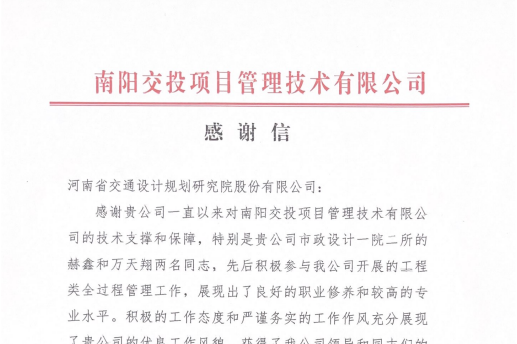 近日,公司收到南阳交投项目管理技术有限公司发来的感谢信,对我公司在南阳交投项目管理技术有限公司开展的工程类项目全过程管理工作提供的尊龙ag旗舰厅的技术支持表示感谢,特别对市政设计一院选派的赫鑫和万天翔同志在工作期间...