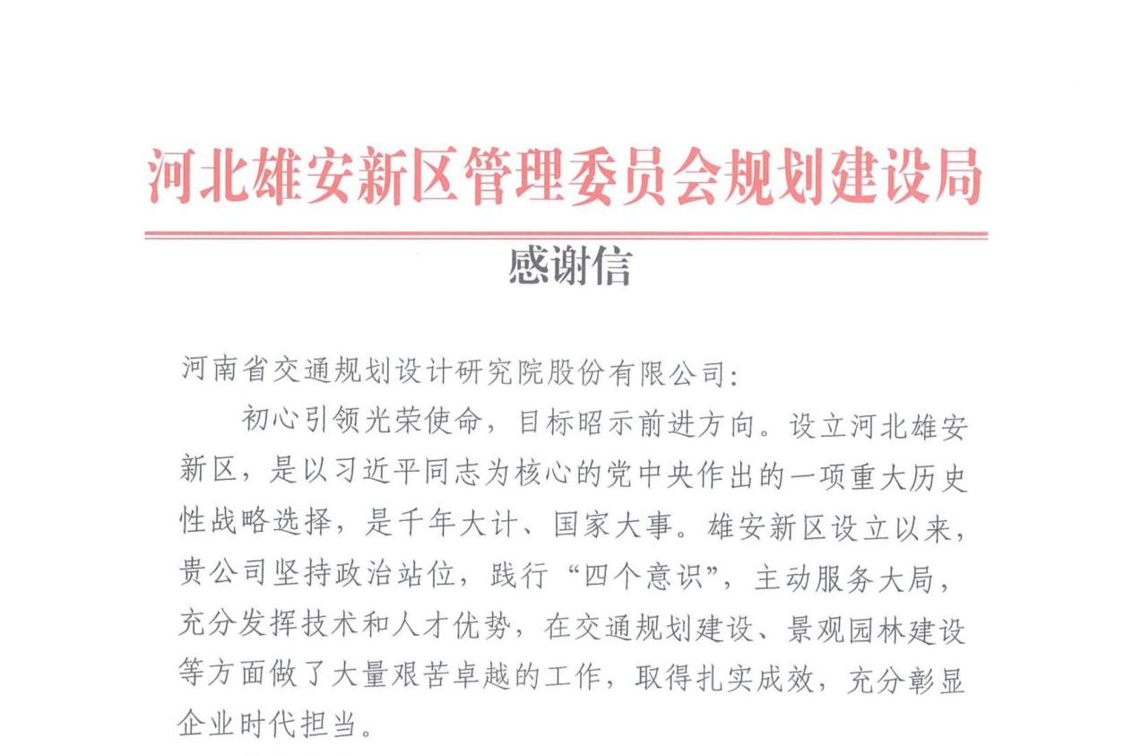 近日,公司收到河北雄安新区规划建设局发来的感谢信,对我公司在雄安新区交通规划建设、景观园林建设等方面做出的大量艰苦卓越的工作,以及我公司选派的唐天裔同志在协助规划建设局工作期间,出色地完成各项工作任...