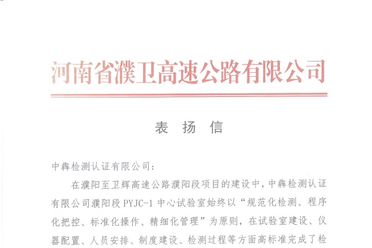 近日,公司所属中犇检测认证有限公司收到了河南省濮卫高速公路有限公司发来的表扬信。表扬信中表示,在濮阳至卫辉高速公路濮阳段项目的建设中,中犇检测认证有限公司濮阳段pyjc-1中心试验室始终以“规范化检测、程...