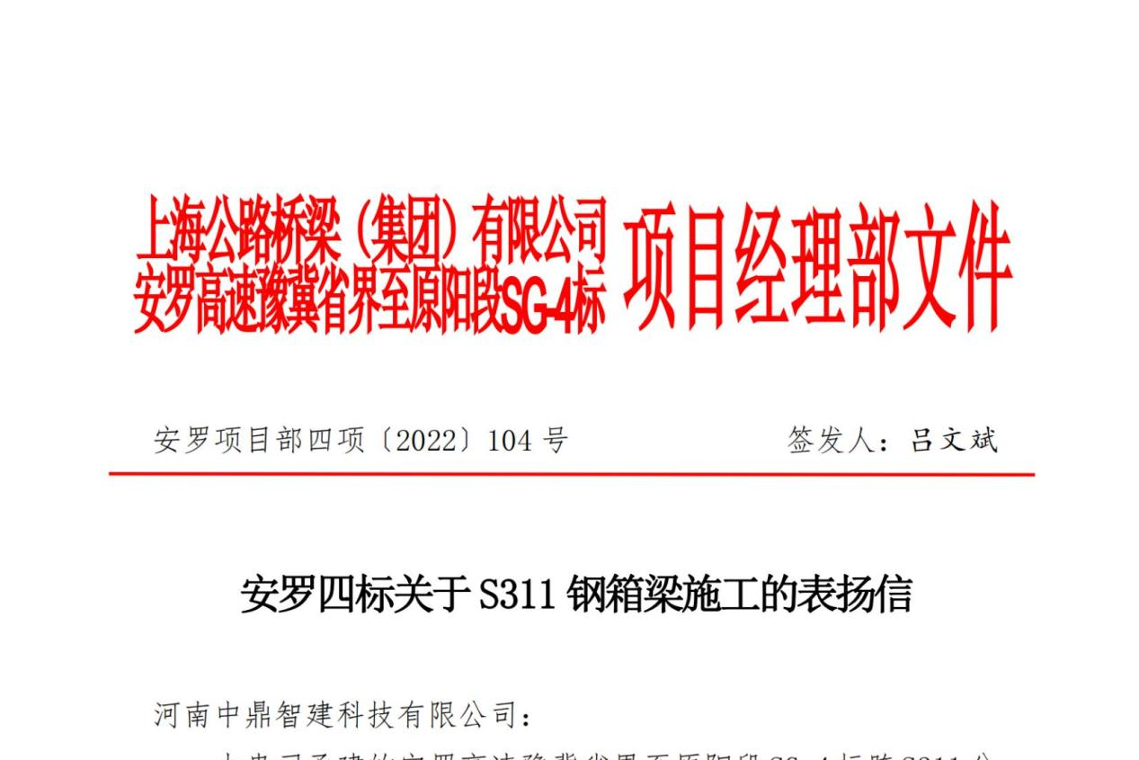 2022年12月27日,河南中鼎智建科技有限公司收到上海公路桥梁(集团)有限公司、中交第二航务工程局有限公司表扬信,对公司承建的安罗高速豫冀省界至原阳段4标跨s311分离式立交钢箱梁项目、原郑一标梁寨枢纽跨兰原高...