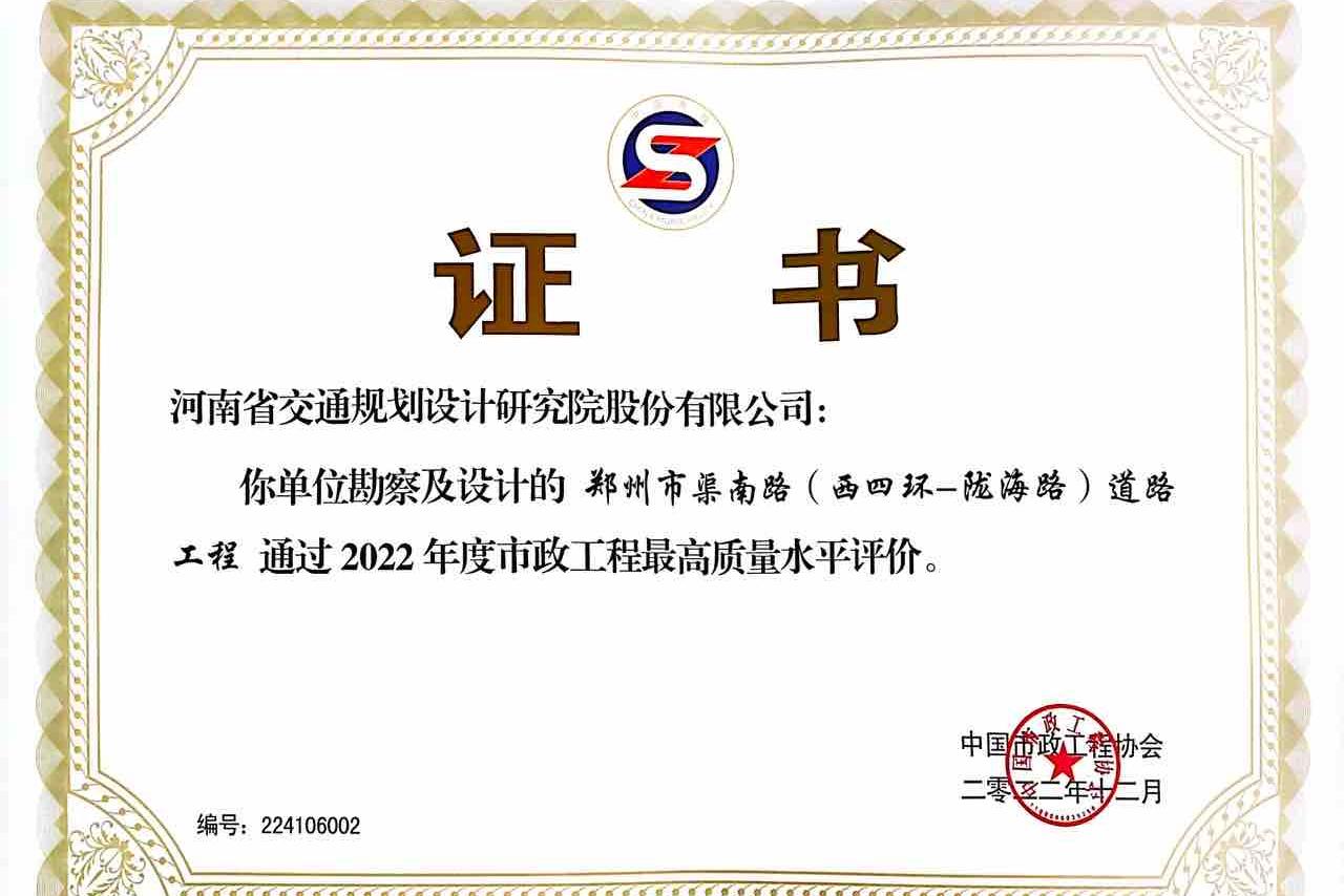 2022年 12月27日,2022年度市政工程建设产业博览会上,对通过全国市政工程最高质量水平评价的工程进行表彰。由郑州市市政工程总公司承建、我单位承担勘察设计的郑州市渠南路(西四环-陇海路)道路工程荣获2022年度全...