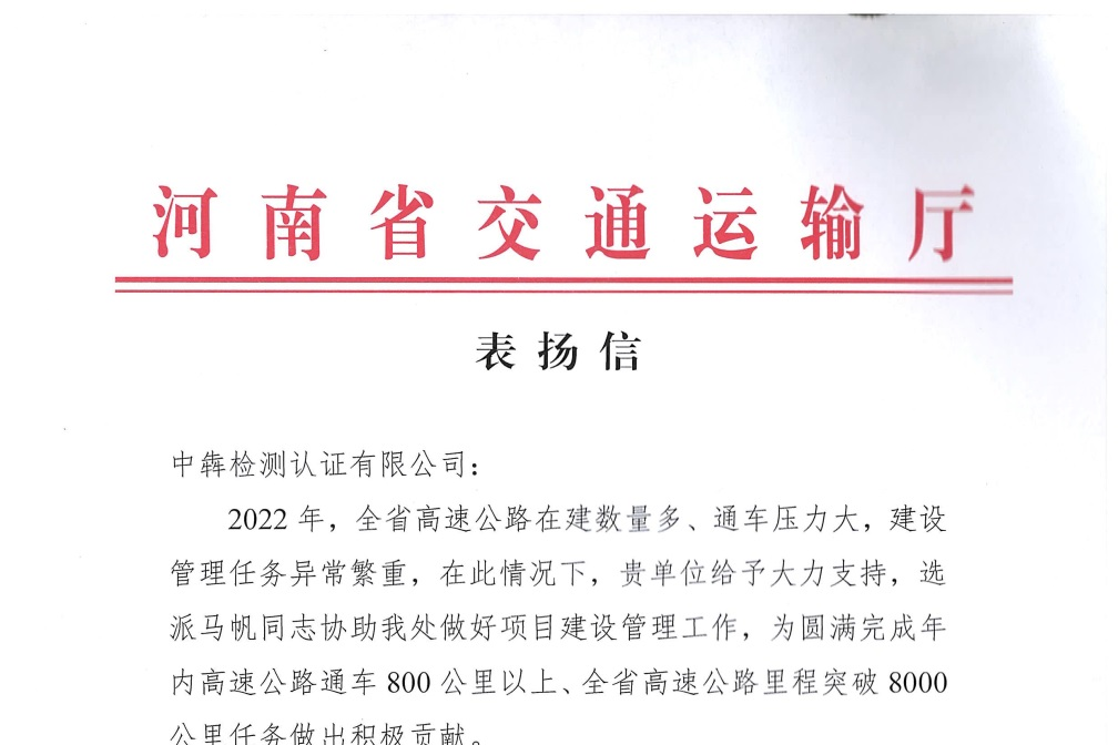 近日,公司所属中犇检测认证有限公司收到了河南省交通运输厅建设管理处和河南省许平南高速公路有限责任公司安林运营管理处发来的表扬信。 河南省交通运输厅建设管理处发来的表扬信中对中犇检测认证有限公司在高...