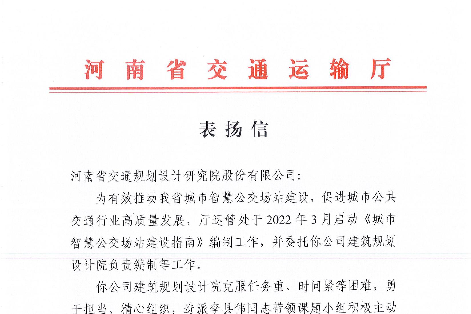 2022年12月1日,公司收到河南省交通运输厅表扬信,对建筑规划设计院在《城市智慧公交场站建设指南》编制期间的工作给予充分的肯定,并表示衷心的感谢,同时对部门李县伟及课题小组其他成员扎实的工作作风和高度的...