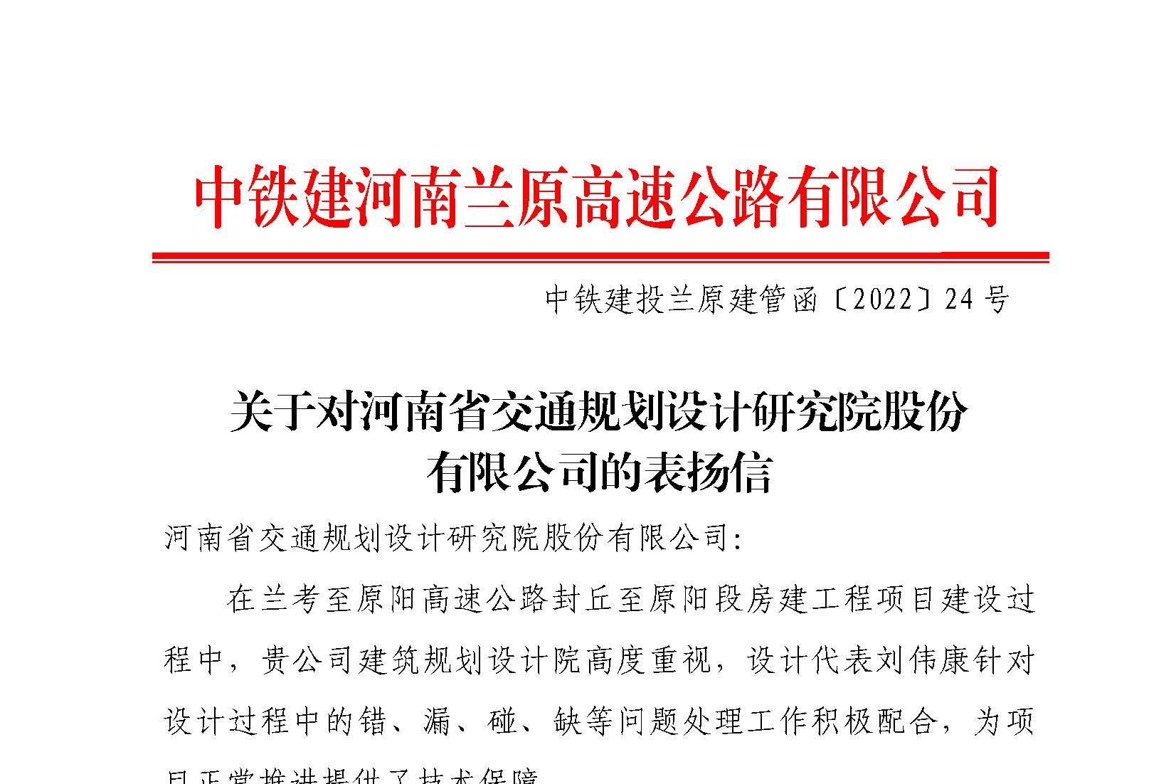 2022年12月5日,公司收到中铁建河南兰原高速公路有限公司表扬信,对建筑规划设计院在兰考至原阳高速公路封丘至原阳段房建工程项目建设过程中的技术指导和后期服务工作给予高度评价,并表示衷心的感谢,同时对设计...