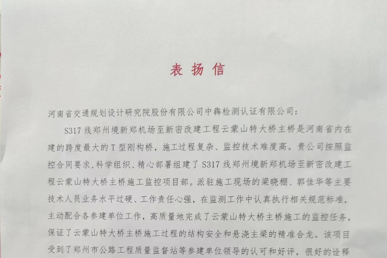 近日,公司所属中犇检测认证有限公司收到上海公路桥梁(集团)有限公司发来的感谢信,对中犇检测认证有限公司委派梁晓棚、郭佳华等主要技术人员参加s317线郑州境新郑机场至新密改建工程云蒙山特大桥的施工监控工作表...