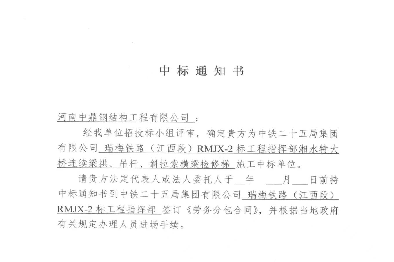 近日,经中铁二十五局集团有限公司瑞梅铁路(江西段)rmjx-2 标工程指挥部组织的瑞梅铁路(江西段) rmjx-2 标工程指挥部湘水特大桥连续梁拱、吊杆、斜拉索横梁检修梯项目招投标小组评审,河南中鼎智建科技有限公司成...