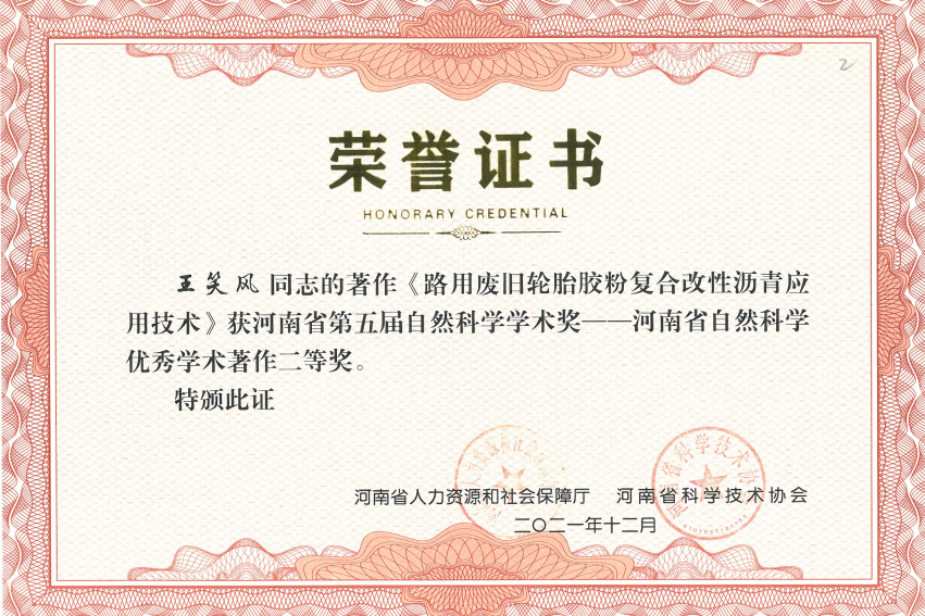 根据河南省人力资源和社会保障厅、河南省科学技术协会印发的《关于表彰河南省第五届自然科学学术奖的决定》(豫人社发〔2021〕37号)文件,工程技术研究院编著的《路用废旧轮胎胶粉复合改性沥青应用技术》,荣获“河...
