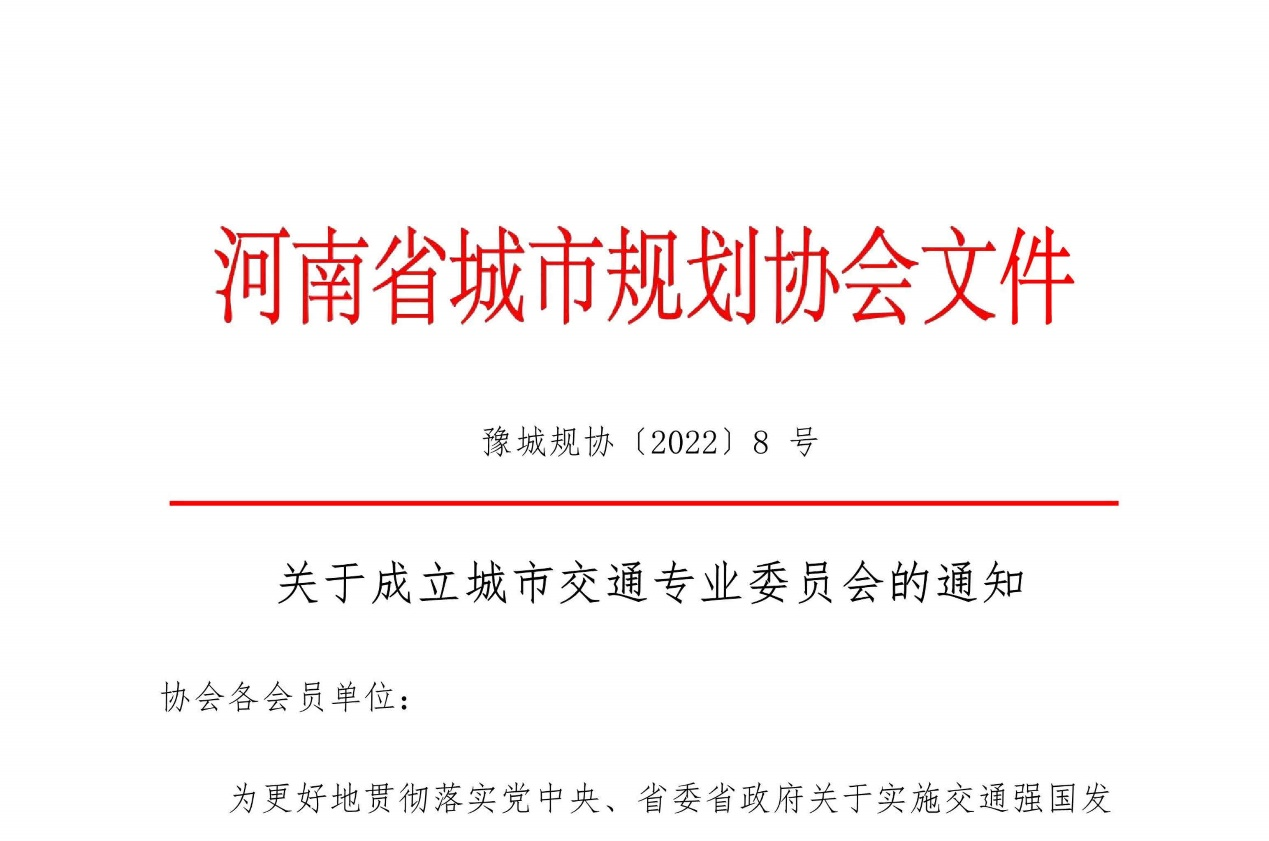 为促进城市交通高质量发展,切实加强我省城市交通学术交流和技术创新,经河南省城市规划协会第二届常务理事会第六次会议研究通过,决定成立城市交通专业委员会,主任委员单位为河南省交通规划设计研究院股份有限公...