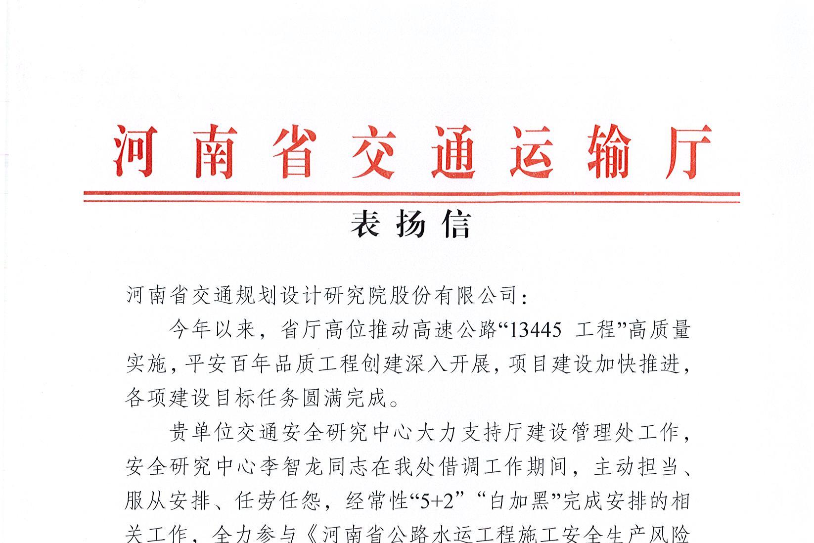 2021年12月26日,公司收到河南省交通运输厅表扬信,对公司长期以来的大力支持予以肯定,对交通安全研究中心李智龙同志主动担当、任劳任怨,在工作中展现了极强的责任意识和过硬的业务能力提出了表扬。 下一步,...
