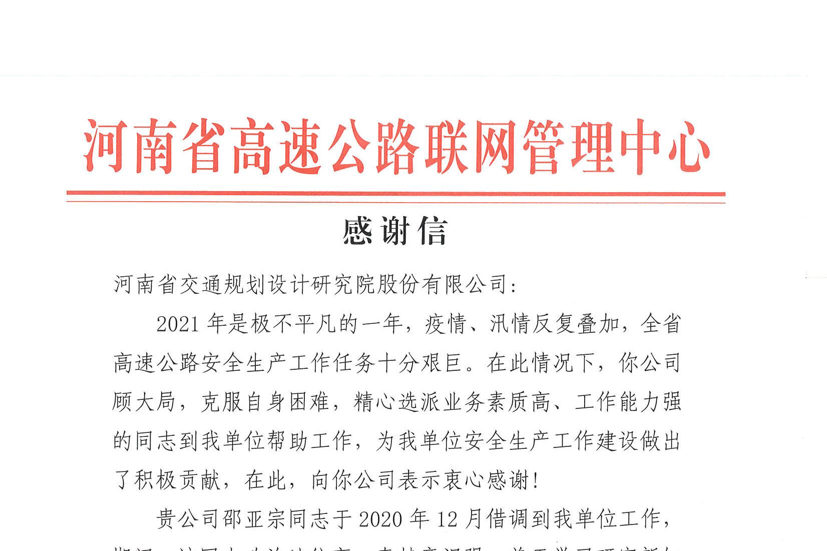 1月26日,公司收到河南省高速公路联网管理中心感谢信,对公司的大力支持表示感谢。 表扬信中对公司克服困难顾大局予以肯定;对交通安全研究中心邵亚宗同志在工作中保持强烈的责任心和严谨的工作作风提出了表扬。 ...