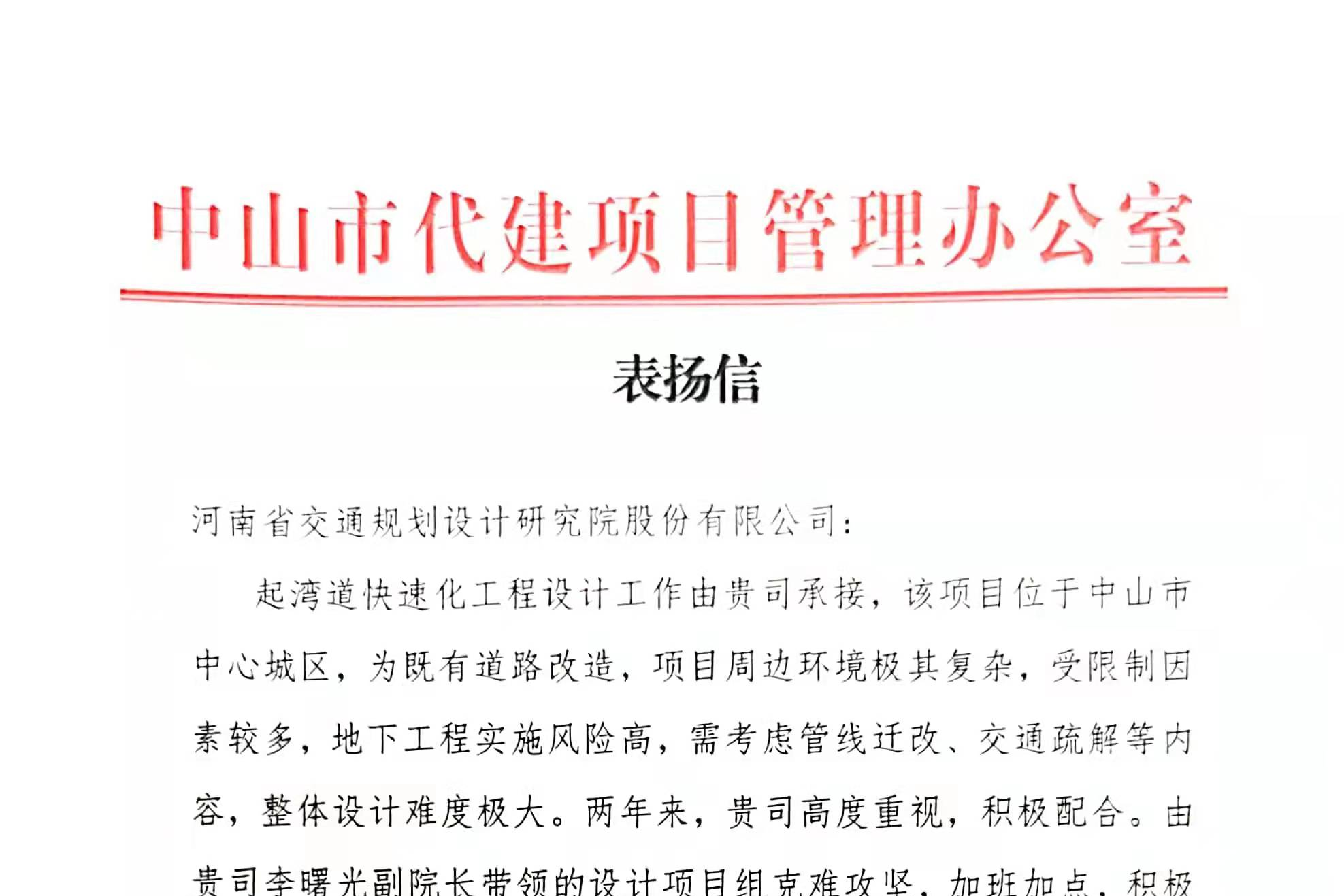 2021年12月28日,公司收到中山市代建项目管理办公室表扬信,对过去两年来,城地院李曙光副院长及设计项目组全体人员克难攻坚,加班加点,积极主动解决起湾道快速化工程各种方案技术问题,为项目推进提供保障给予了...