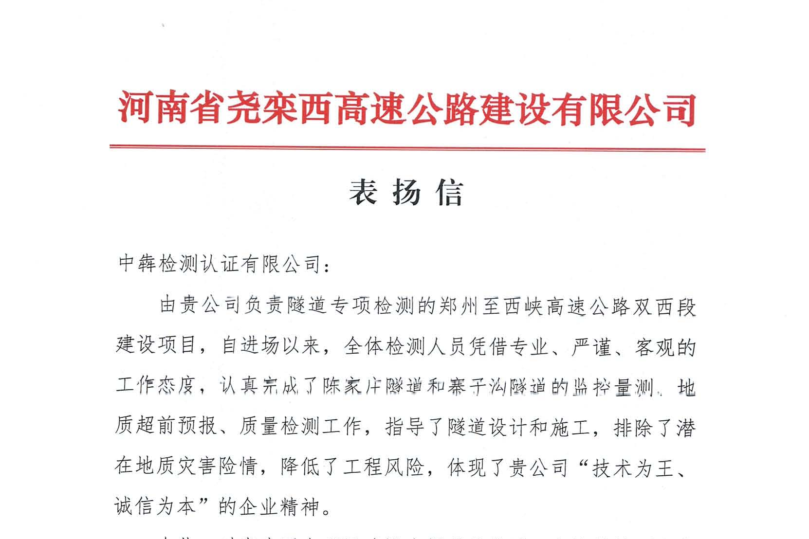 近日,公司所属中犇检测认证有限公司收到了河南省尧栾西高速公路建设有限公司发来的表扬信,表扬信中对中犇检测认证有限公司在郑州至西峡高速公路双西段建设项目隧道监控、量测工作中提供的优质、高效服务表示了感...