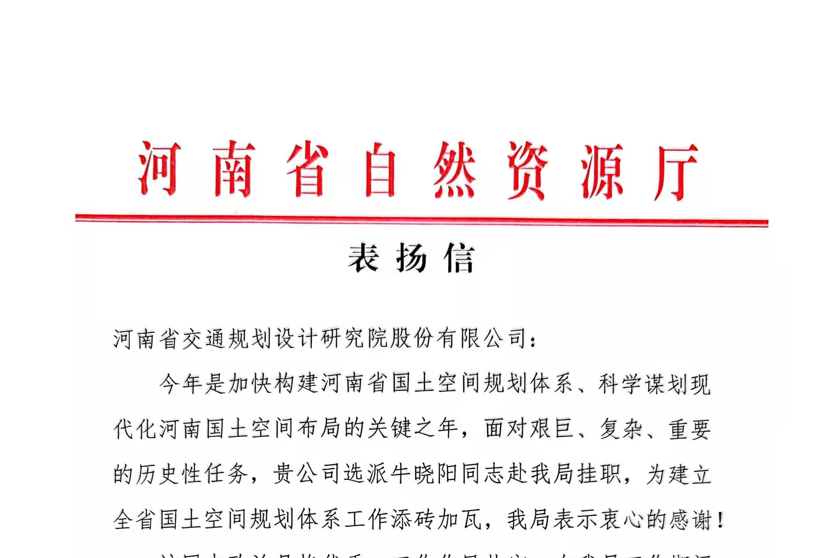 近日,公司收到河南省自然资源厅国土空间规划局发来的表扬信,对公司长期以来的大力支持表示衷心感谢,对综合规划院牛晓阳同志过硬的专业素质和极强的责任担当给予充分肯定,并希望我公司继续支持省自然资源厅工作...
