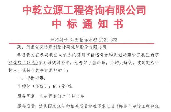 在公司领导和市场部的大力支持与帮助下,2021年11月23日,工程测绘与地理信息研究院在郑州市自然资源和规划局建设工程正负零验线项目服务机构资格选聘竞标中,凭借过硬的技术实力,扎实高效的工作作风,良好的企业...