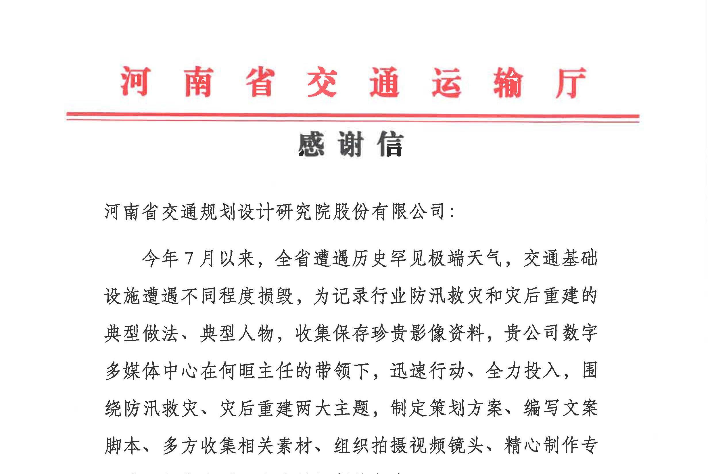 河南省交通运输发展集团有限公司向公司发来感谢信