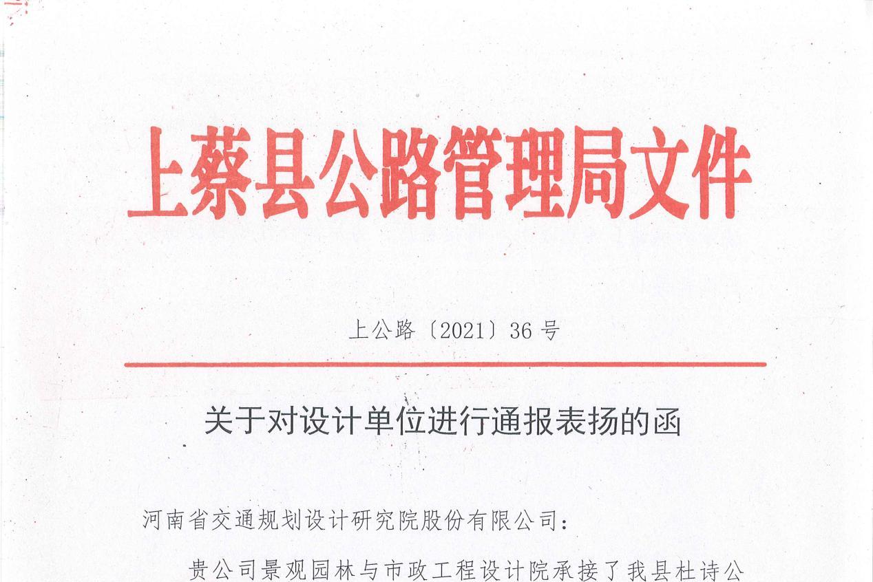2021年4月8日,公司景观园林与市政工程设计院收到一封《关于对设计单位进行通报表扬的函》,发函单位为驻马店市上蔡县公路管理局。 表扬函中上蔡县公路管理局对公司景观园林与市政工程设计院在上蔡县杜诗公园内...