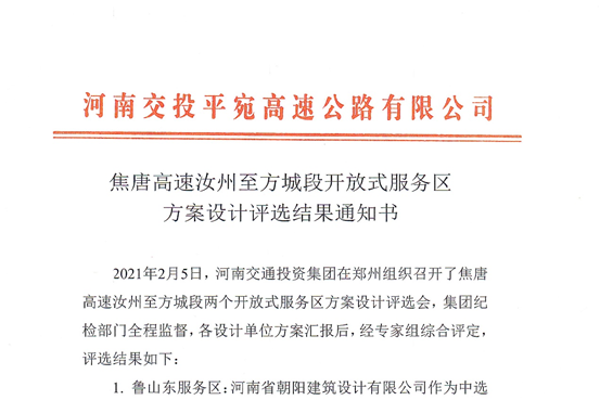 河南交通投资集团有限公司于2021年1月公开邀请国内6家优秀设计单位参与焦唐高速汝州至方城段两个开放式服务区方案设计竞赛。 经专家组综合评定,河南省交通规划设计研究院股份有限公司凭借创新的设计理念和优秀...