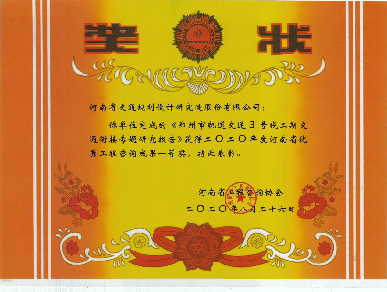 河南省工程咨询协会近日进行了2020年度优秀工程咨询成果奖的评选活动,经过协会组织专家进行评选审定,我公司共获得奖项19项。其中包括一等奖4项,即《郑州市轨道交通3号线二期交通衔接专题研究报告》、《河南省新...