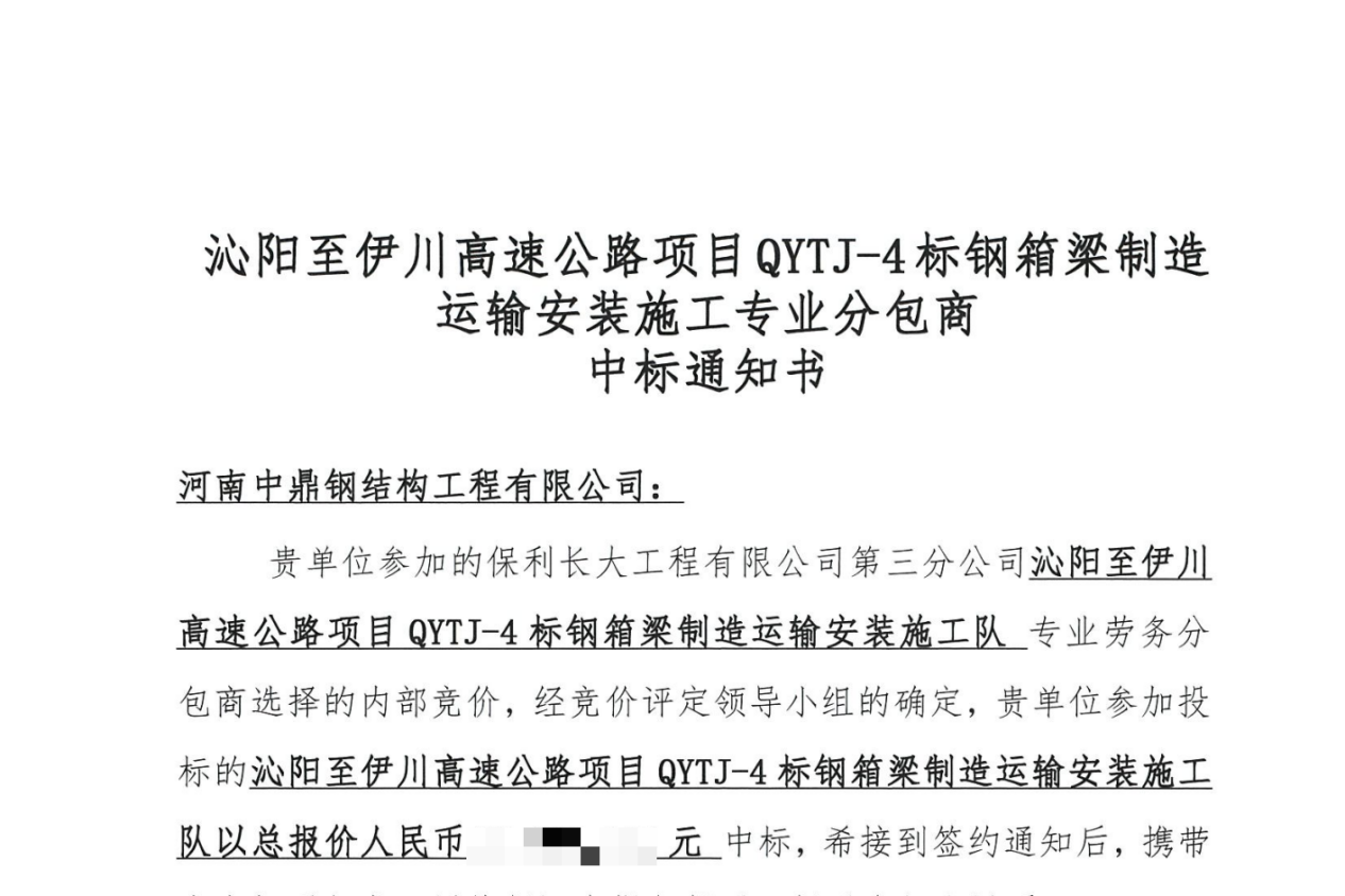 近日,在保利长大工程有限公司第三分公司组织的沁阳至伊川高速公路qytj-4标钢箱梁制造运输安装工程项目公开招标中,河南中鼎智建科技有限公司成功中标。 沁阳至伊川高速公路,是河南省政府批复的《河南省高速公...