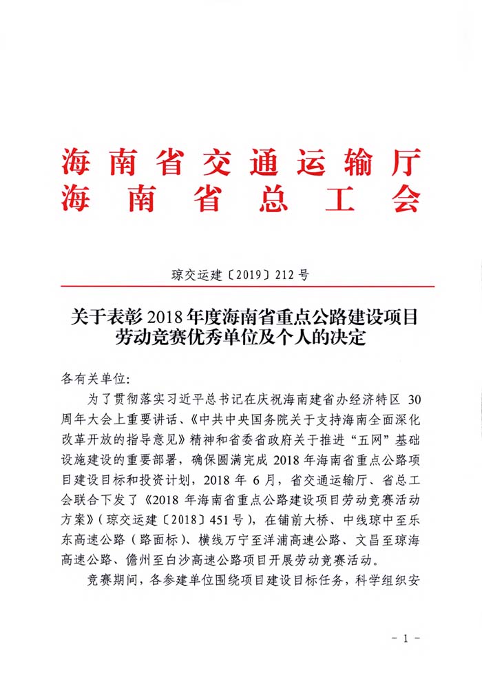 近日,海南省交通运输厅、海南省总工会联合下发文件,表彰2018年度海南省重点公路建设项目劳动竞赛优秀单位及个人。高建公司作为参建单位(监理项目:文昌至琼海高速公路)被评为优秀监理单位,该项目总监范光明同志...