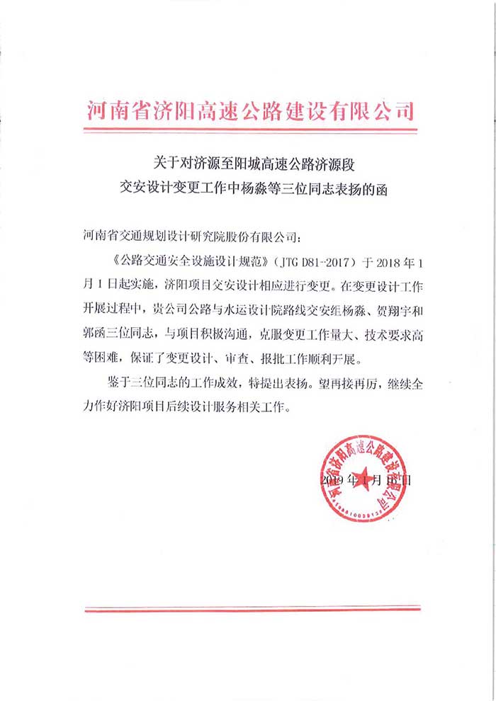 近日,河南省济源至阳城高速公路建设有限公司向我公司来函表扬公路与水运设计院交安设计组杨淼、贺翔宇和郭函三位同志。表扬函中称我公司公路与水运设计院交安设计组积极配合项目公司进行交安工程变更设计、审查及...
