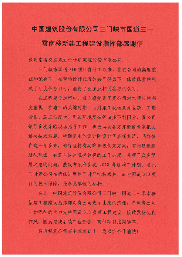 中国建筑股份有限公司建设指挥部来函感谢近日,中国建筑股份有限公司三门峡市国道三一零南移新建工程指挥部向我公司发来感谢信,由衷感谢我公司对项目的高度重视和积极配合,在现场设计代表的共同努力下,保值保量...