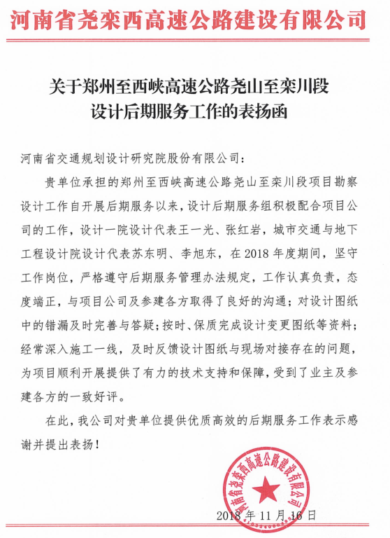 近日,河南省尧栾西高速公路建设有限公司向我公司来函表扬郑州至西峡高速公路尧山至栾川段后期服务工作。表扬函中称该项目设计后期服务组积极配合项目公司工作,设计代表王一光、张红岩、苏东明、李旭东等人工作认...