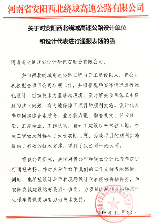 近日,河南省安阳西北绕城高速公路有限公司向我公司来函表扬安阳西北绕城高速公路设计单位和设计代表。表扬函中称我公司设计单位和设计代表积极配合项目公司各项工作,根据现场实际情况优化设计、及时解决项目施工...