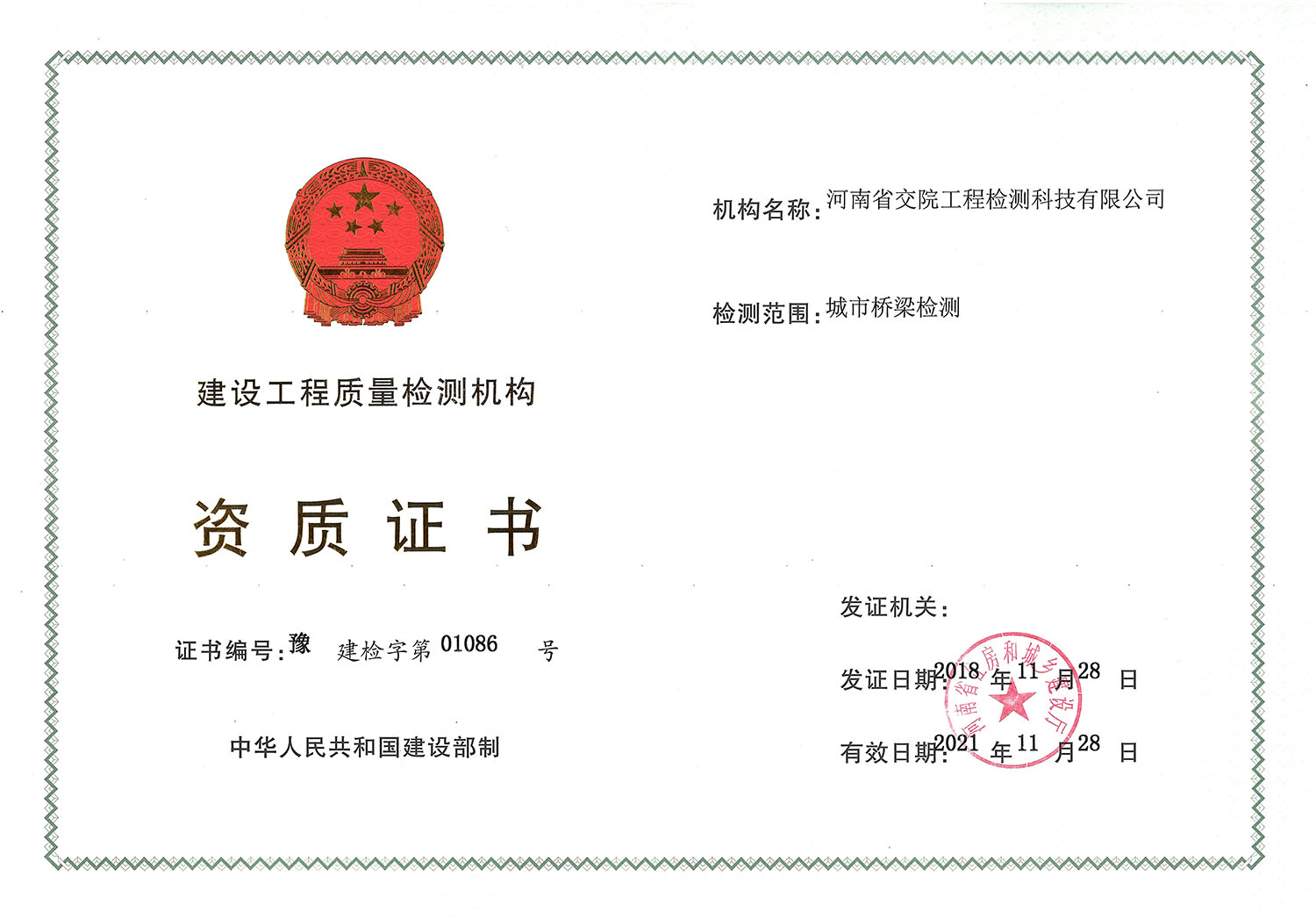 近日,河南省住房和城乡建设厅公布了2018年第六批建设工程质量检测机构资质审查结果,公司所属检测科技公司顺利获得了城市桥梁检测资质。至此我公司顺利完成了建设工程质量检测主要资质的申请工作。到目前为止,检...