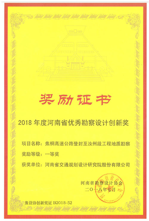 河南省勘察设计协会近日进行了2018年度勘察设计创新奖的评选活动,经过协会组织专家进行评选审定,我公司共获得奖项10项。其中包括一等奖3项,即《焦桐高速公路登封至汝州段工程地质勘察》、《林州至长治(省界)高...
