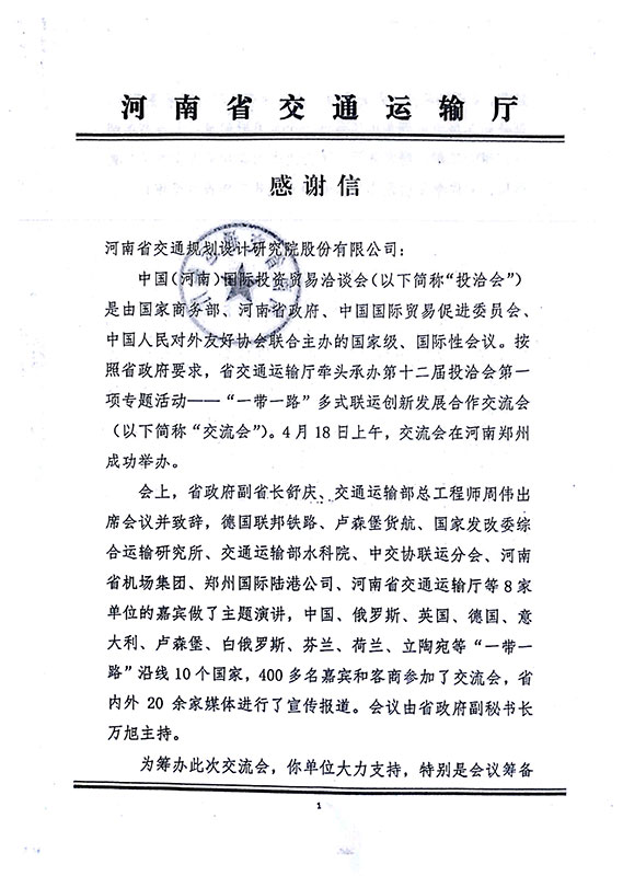 近日,河南省交通运输厅向公司发来感谢信,对公司在筹办“中国(河南)国际投资贸易洽谈会“一带一路”多式联运创新发展合作交流会”中所做出的大量卓有成效工作表示感谢。同时,对公司委派参与会议筹备工作的任晓杰...