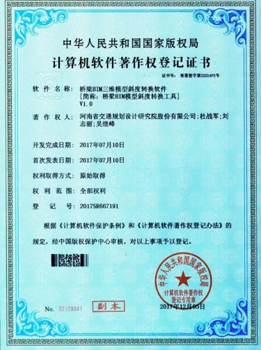 近日,我公司bim技术研发中心申报的《桥梁bim三维模型斜度转换软件》获得国家计算机软件著作登记证书。该软件将正交桥梁构件根据设计需求进行不同角度的旋转,实现了三维斜交桥梁的设计,很大程度上提高了设计人员...