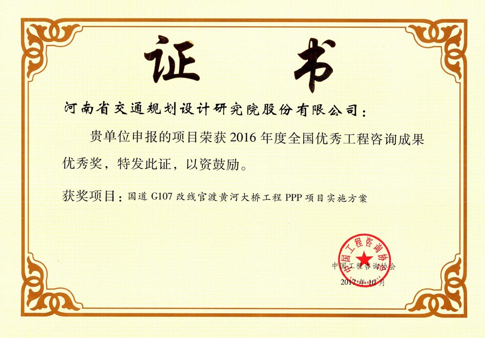 中国工程咨询协会近日公布了“2016年度全国优秀工程咨询成果奖”获奖项目名单,经过协会组织专家进行集中评审、公示,我公司所申报项目《国道g107改线官渡黄河大桥工程ppp项目实施方案》获得优秀奖。