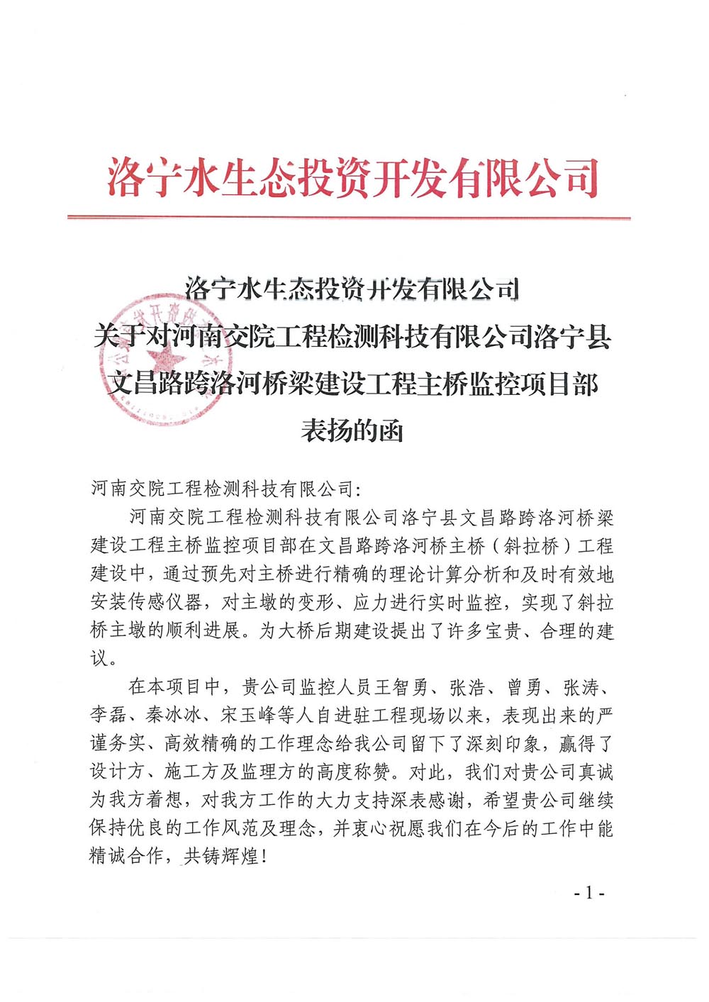 近日,洛宁水生态投资开发有限公司下发了《关于对河南交院工程检测科技有限公司洛宁县文昌路跨洛河桥梁建设工程主桥监控项目部表扬的函》,对公司所属检测科技公司跨洛河桥主桥施工监控项目部进行了通报表扬。通报...