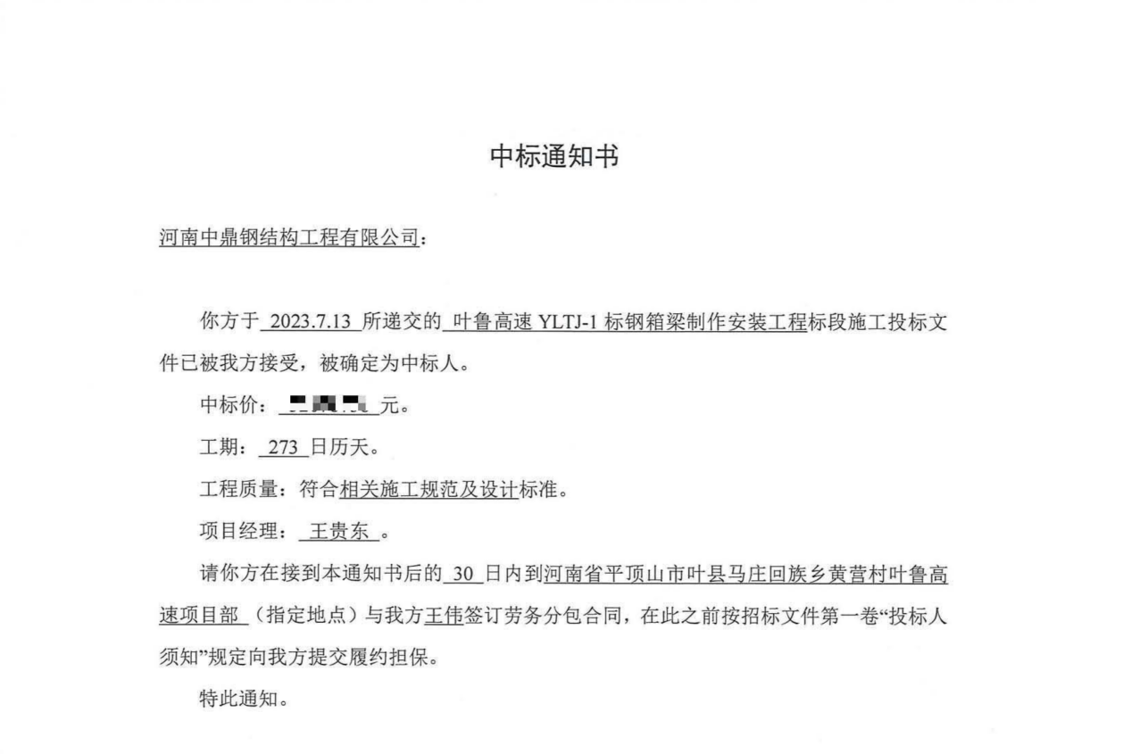 近日,在中交二公局第四工程有限公司组织的叶鲁高速yltj-1标钢箱梁制作安装工程项目公开招标中,河南中鼎智建科技有限公司成功中标。 该项目地点位于河南省平顶山市叶县,合同体量为12281吨。中标内容包括常宋互...