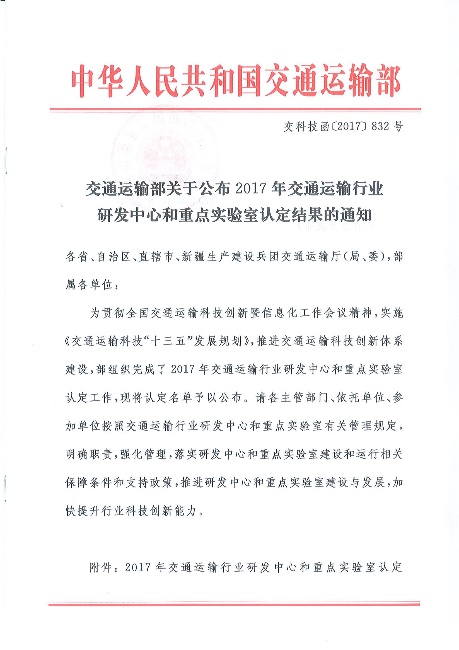 近日,根据交通运输部发布的《交通运输部关于公布2017年交通运输行业研发中心和重点实验室认定结果的通知》(交科技函〔2017〕832号),我公司申报的“公路建设与养护技术、材料及装备交通运输行业研发中心”在经过...