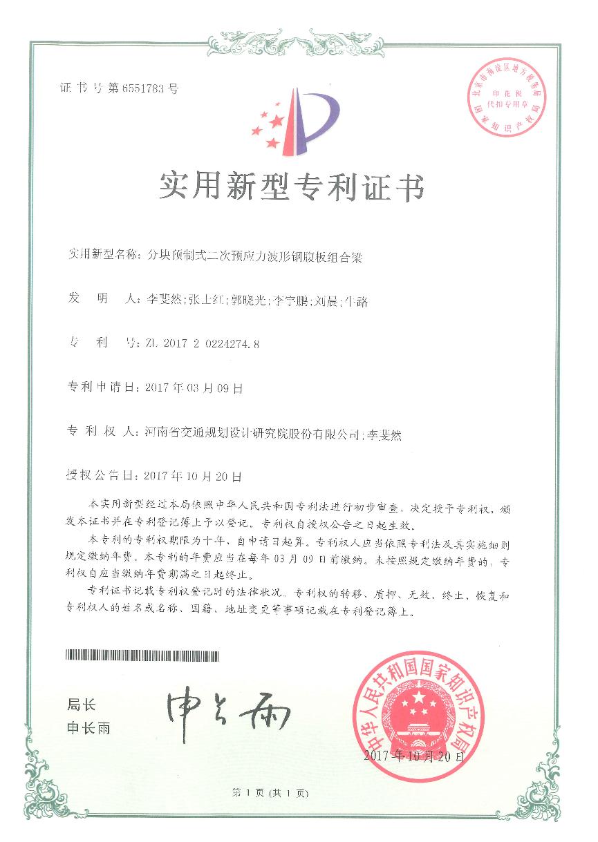 近日,由公司桥梁设计研究院申报的《分块预制的先张法预应力波形钢腹板组合箱梁》、《分块预制式二次预应力波形钢腹板组合梁》、《基于混合预应力的装配式波形钢腹板组合箱梁》、《装配式先张法预应力波形钢腹板组...
