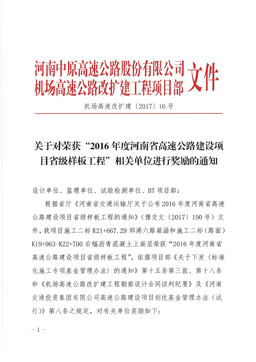 近日,我公司设计的机场高速改扩建工程k21 667.29郑港六路箱涵和k19 963-k22 700右幅沥青混凝土上面层荣获“2016年度河南省高速公路建设项目省级样板工程”。业主发文嘉奖并对我公司进行奖励。
