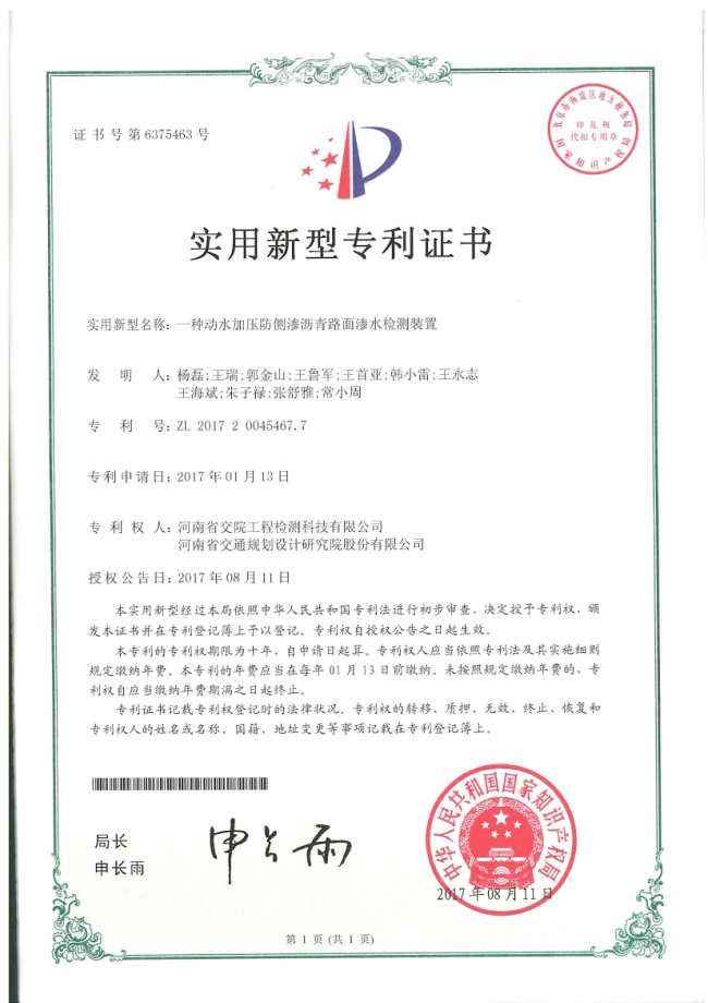 近日,公司所属检测科技公司申报的“一种动水加压防侧渗沥青路面渗水检测装置(zl2017 2 0045467.7)”和“一种防侧渗的恒压变水头的沥青路面渗水检测装置(zl 2017 2 0045445.0)”正式获得了国家实用新型专利授权。...