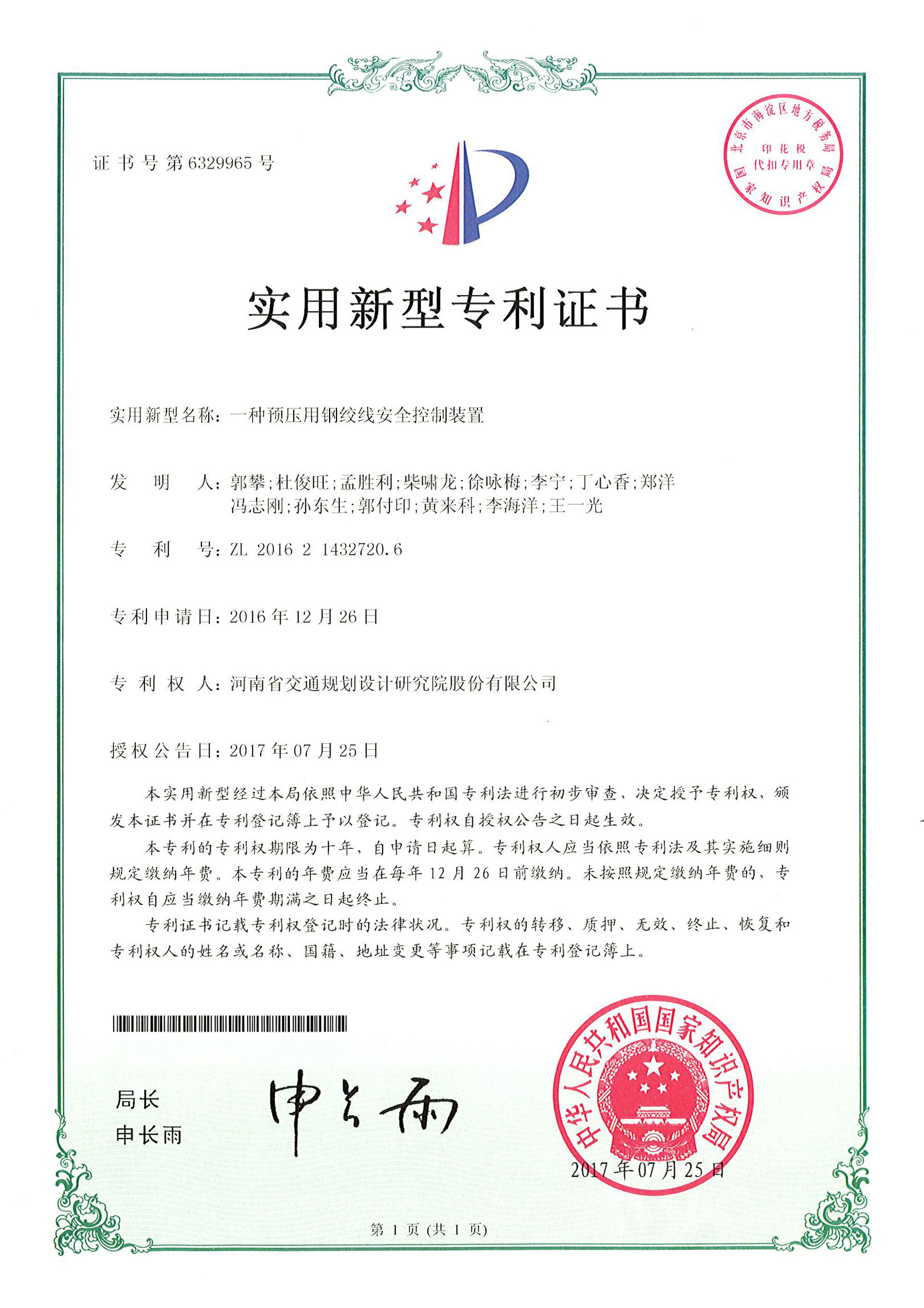 近日,由我公司设计一院申报的《一种预压用钢绞线安全控制装置》顺利通过国家知识产权局授权,并颁发了国家实用新型专利证书。此项专利能够有效减轻风雨等不利因素造成的钢绞线震动,提高钢绞线的张拉安全性。