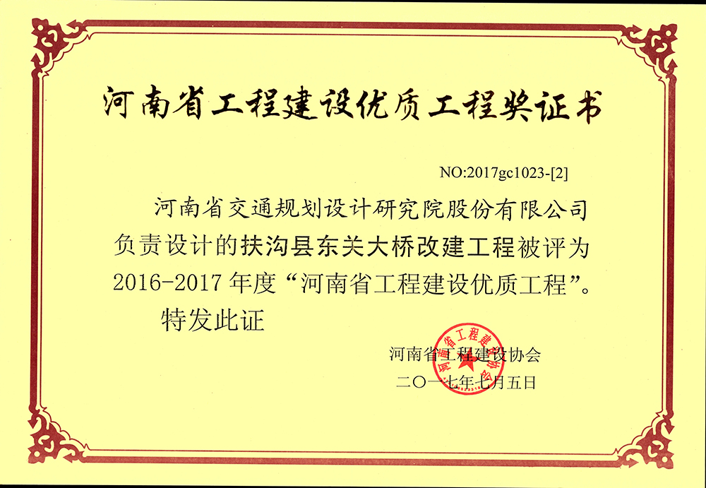 近日河南省工程建设协会颁发了“2016-2017年度河南省工程建设优质工程奖”,我公司设计的两项工程获此荣誉,分别是:《连霍高速公路洛阳至三门峡(豫陕界)段改扩建工程》、《扶沟县东关大桥改建工程》。 此奖项的获...