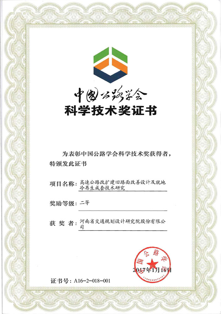 近日,我公司养护院完成的《高速公路改扩建旧路面改善设计及就地冷再生成套技术研究》课题,获得了中国公路学会科学技术奖二等奖。该课题研究成果丰富,其中专利6项,编制地方标准1部,发表核心期刊6篇;出版专著3...