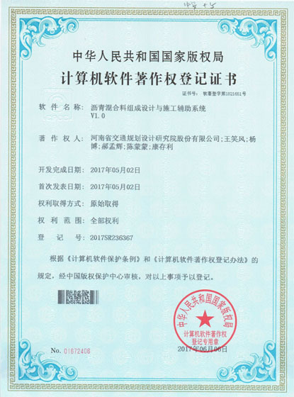 近日,由我公司公路养护设计研究院申报的三项软件《沥青混合料目标配合比设计系统》、《沥青混合料生产配合比设计及验证系统》、《沥青混合料组成设计与施工辅助系统》获国家计算机软件著作权登记证书。三项软件分...