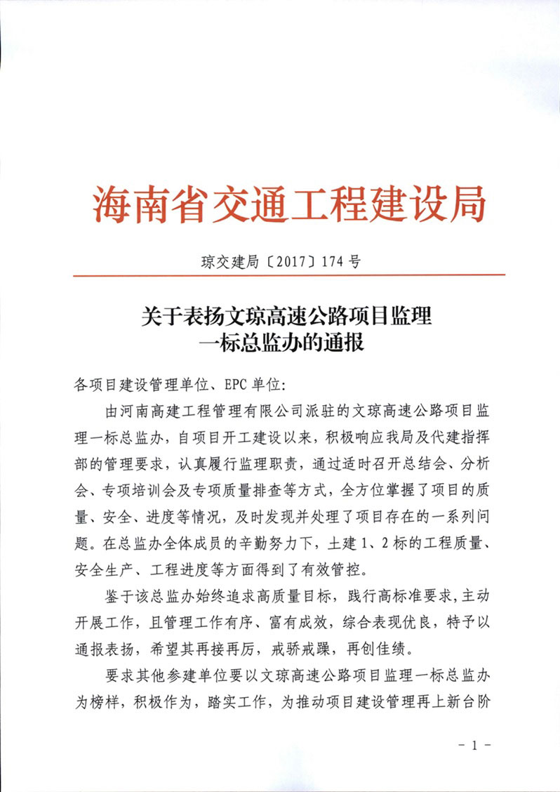 近日,海南省交通工程建设局下发了琼交建局【2017】174号《关于表扬文琼高速公路项目监理一标总监办的通报》文件,对高建公司文琼高速公路项目监理一标总监办进行了通报表扬。通报指出:河南高建工程管理有限公司...